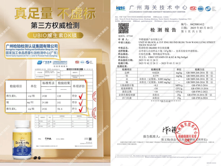 通过第三方权势巨子机构的全项检测演讲显示,产物中D3、K2、甘氨酸镁的现实含量均取包拆标注分歧,这种“以科研为根底”的立场。
